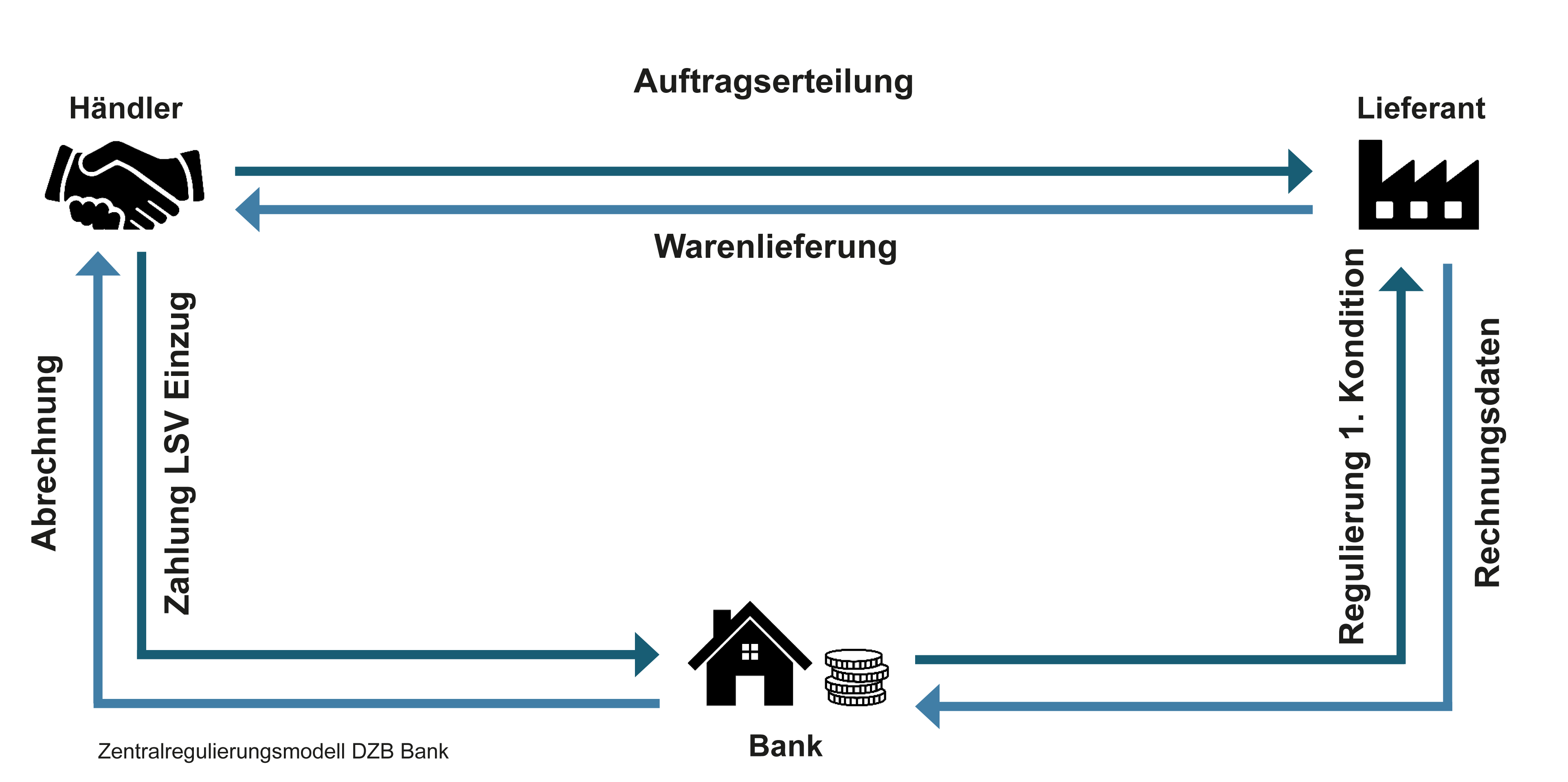 Mit der Zentralregulierung hingegen, stellen Lieferanten die Rechnungen für die bezogene Ware direkt der DZB BANK zu, welche die Rechnungen garantiert und umgehend bezahlt. Die DZB BANK fasst diese erhaltenen Rechnungen zusammen und stellt dem Fachhändler in definierten Abständen eine übersichtliche Sammelrechnung aus. So muss der Fachhändler nur an die DZB BANK bezahlen und nicht an jeden Lieferanten einzeln.