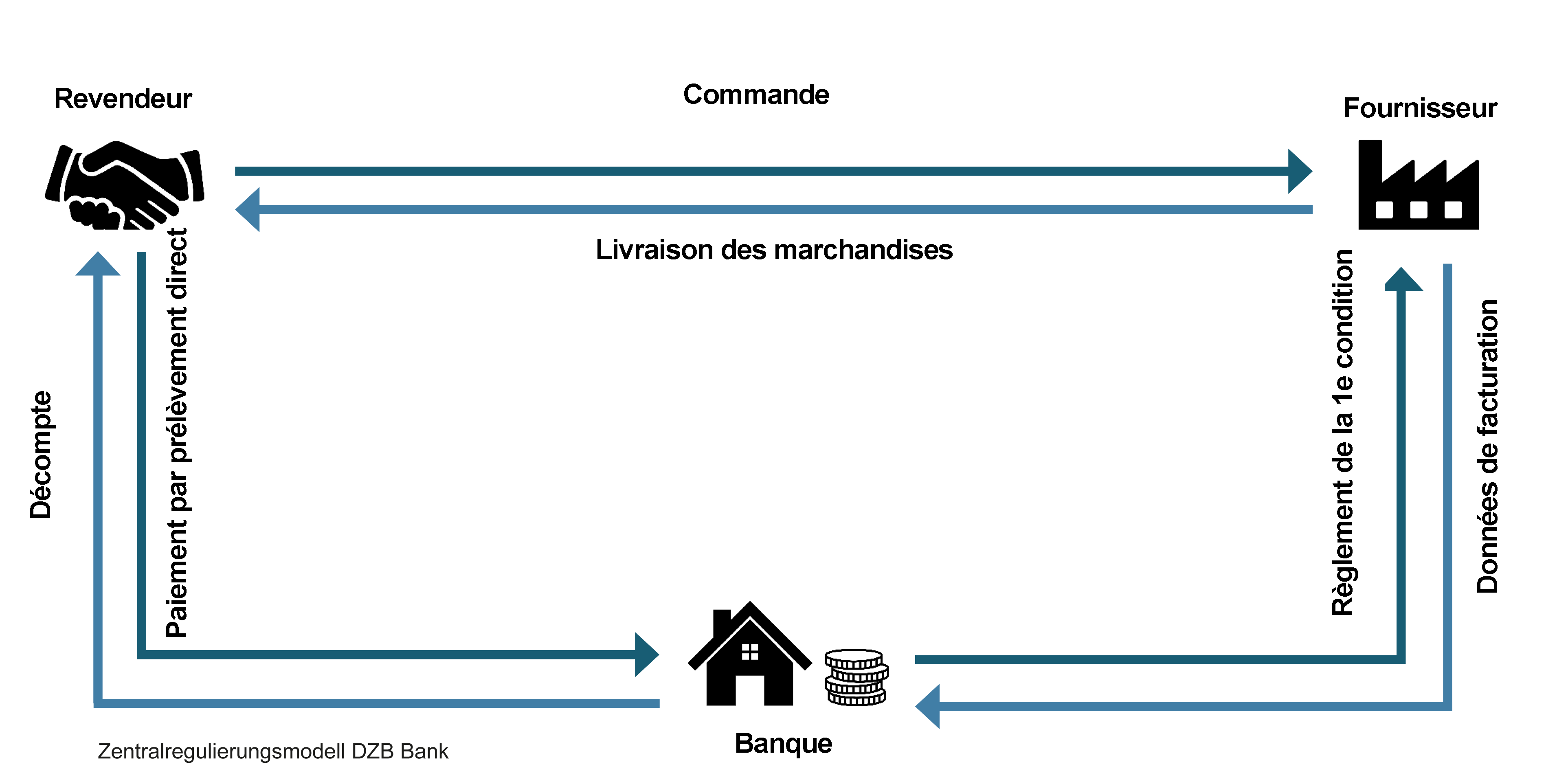 Avec le système de paiement centralisé, les fournisseurs envoient les factures pour les marchandises achetées directement à la DZB BANK, qui garantit le paiement immédiat des factures. La DZB BANK regroupe les factures reçues et envoie au commerçant spécialisé, à intervalles définis, une facture globale claire. Ainsi, le commerçant spécialisé ne doit payer qu'à la DZB BANK et non à chaque fournisseur individuellement.